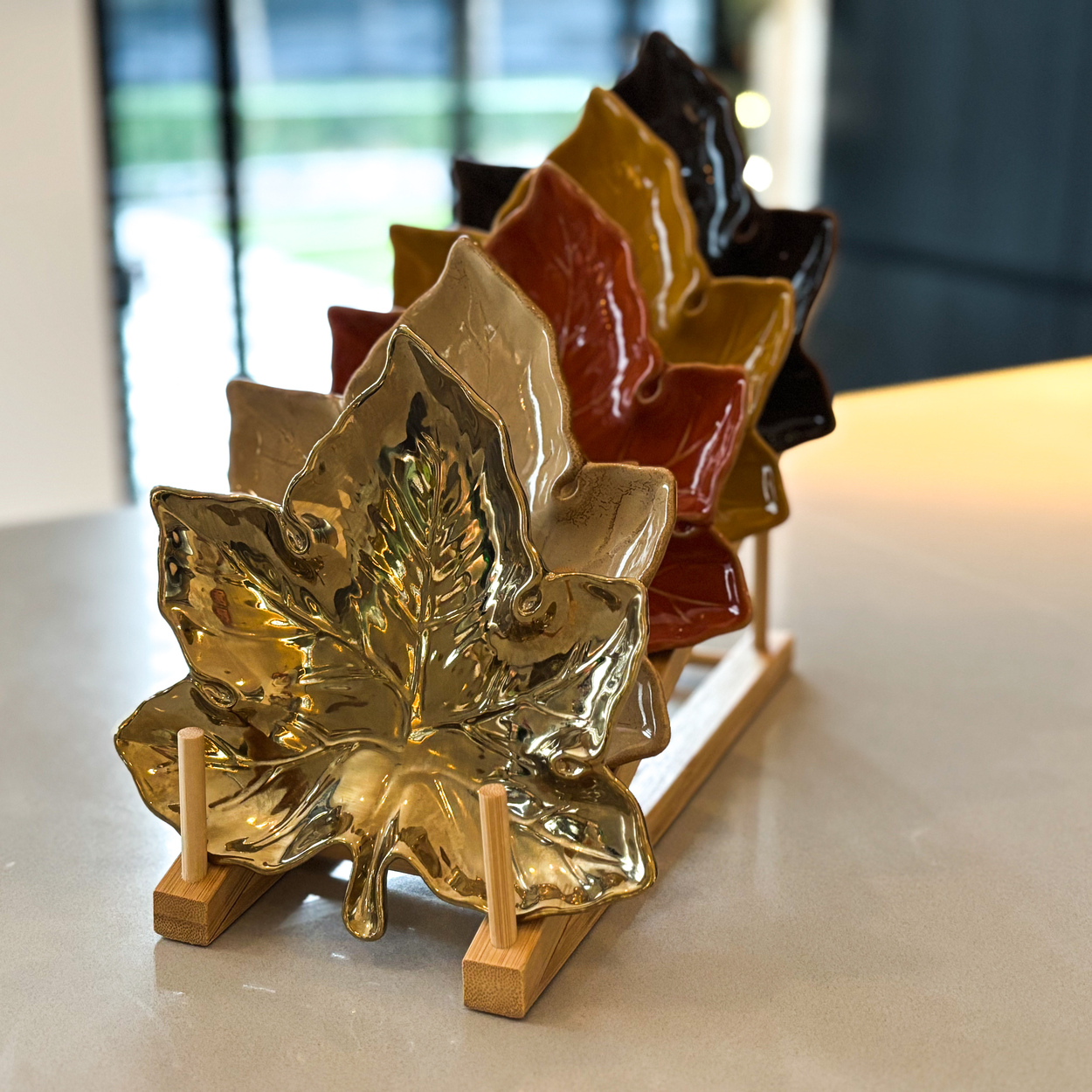 Bladvormig bordje van keramiek in warme herfsttinten